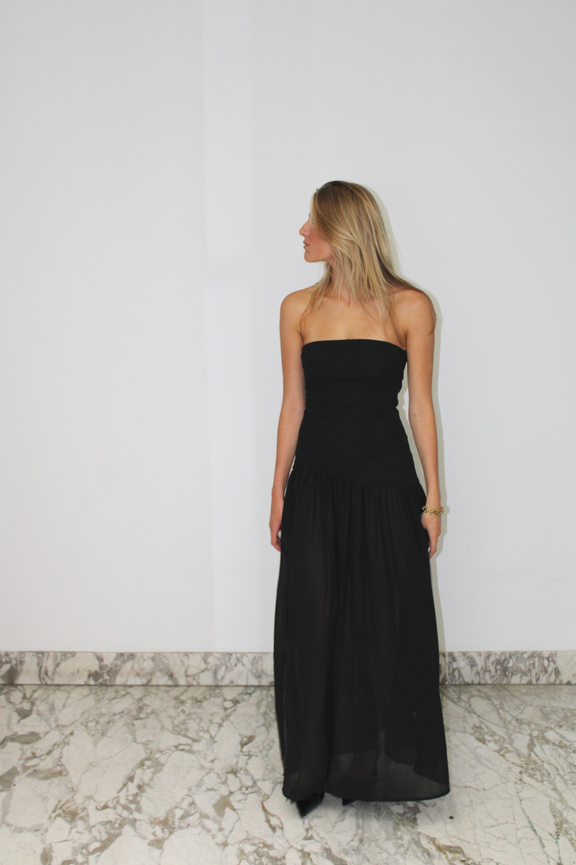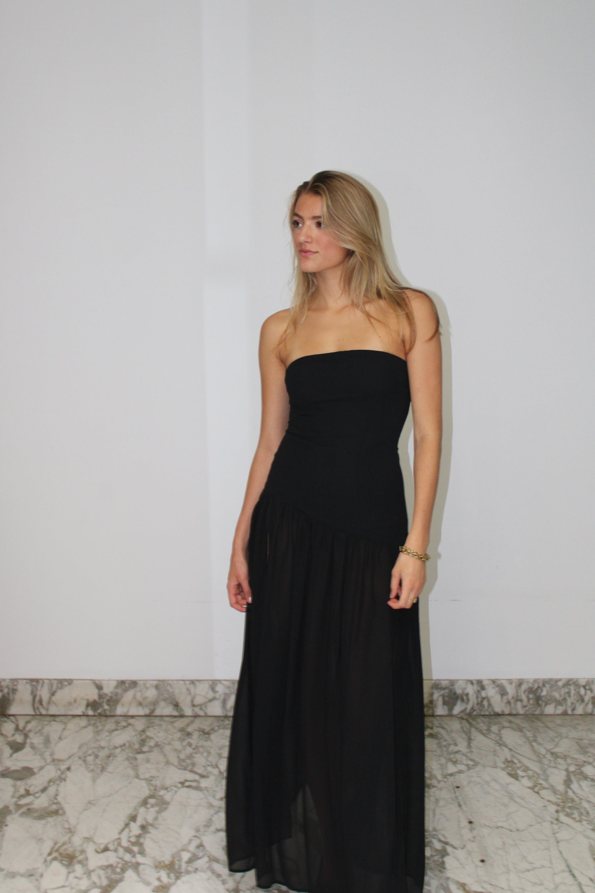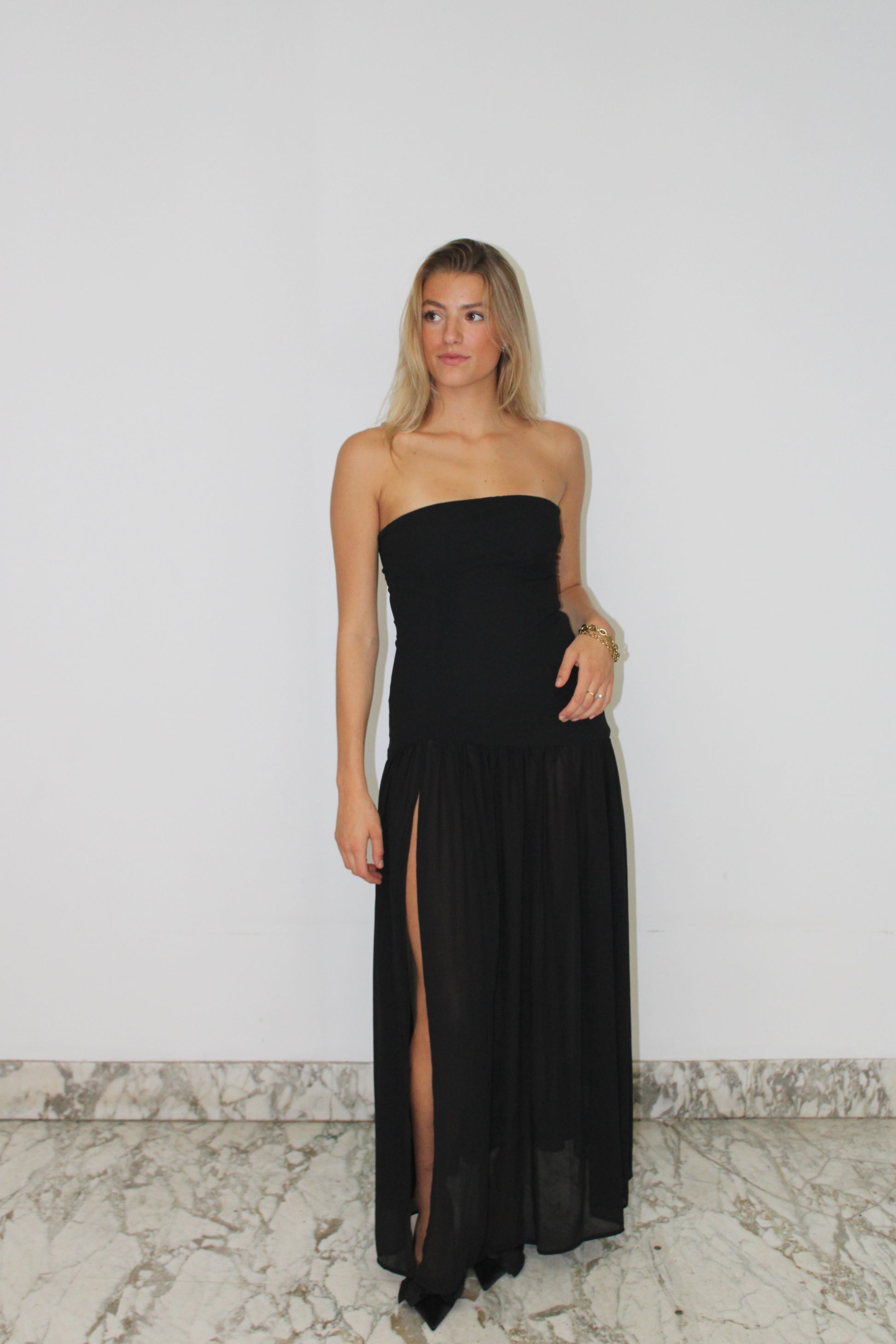 Een elegante avondjurk met een strapless halslijn en een lange, semi-transparante rok. Dankzij de verfijnde en luchtige stof combineert de jurk comfort met stijl.